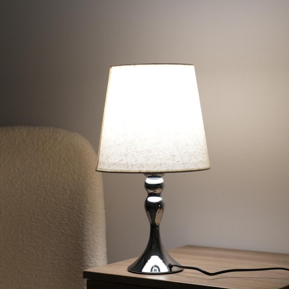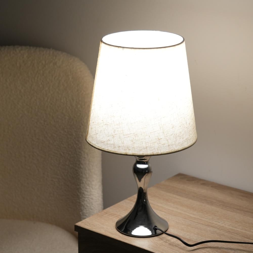 أباجورة طاولة فاخرة بقاعدة معدنية فضية تجمع بين الرقي وجودة الإضاءة و تضفي لمسة أنيقة على أي مساحة في منزلك أو مكتبك.
