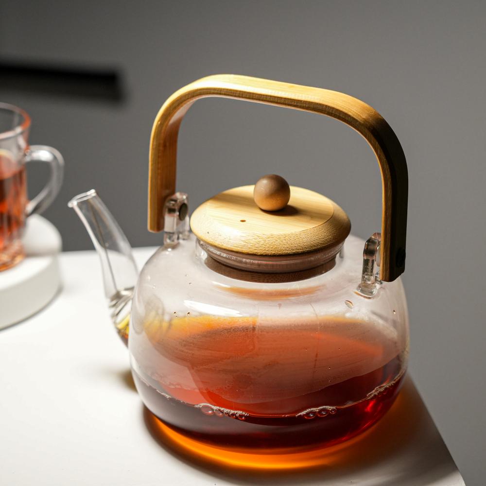 إبريق شاي زجاجي أنيق بمقبض خشبي