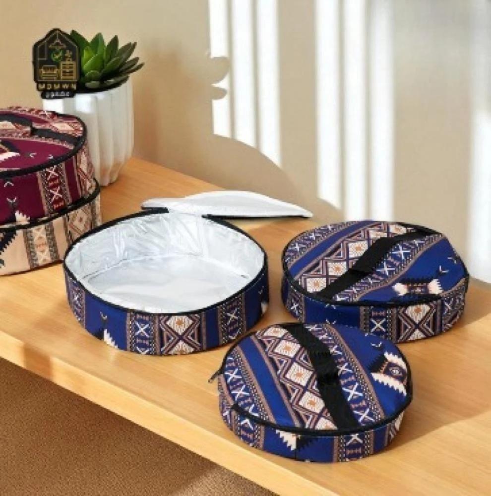 حافظة طعام بتصميم تراثي أنيق مستوحى من النقش النجدي، مصنوعة من خامة قماشية خارجية متينة، مع طبقة داخلية عاكسة للحرارة تساعد في حفظ الطعام ساخنا أو باردا لفترات أطول