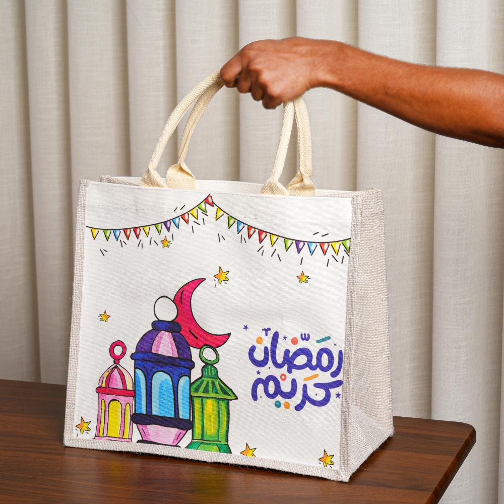 حقيبة رمضانية بتصميم فوانيس ملونة وعبارة رمضان كريم. مناسبة للاستخدامات اليومية الخفيفة مثل حمل الأغراض البسيطة أو التوزيعات، ويمكن الاستفادة منها في أكثر من غرض خلال رمضان