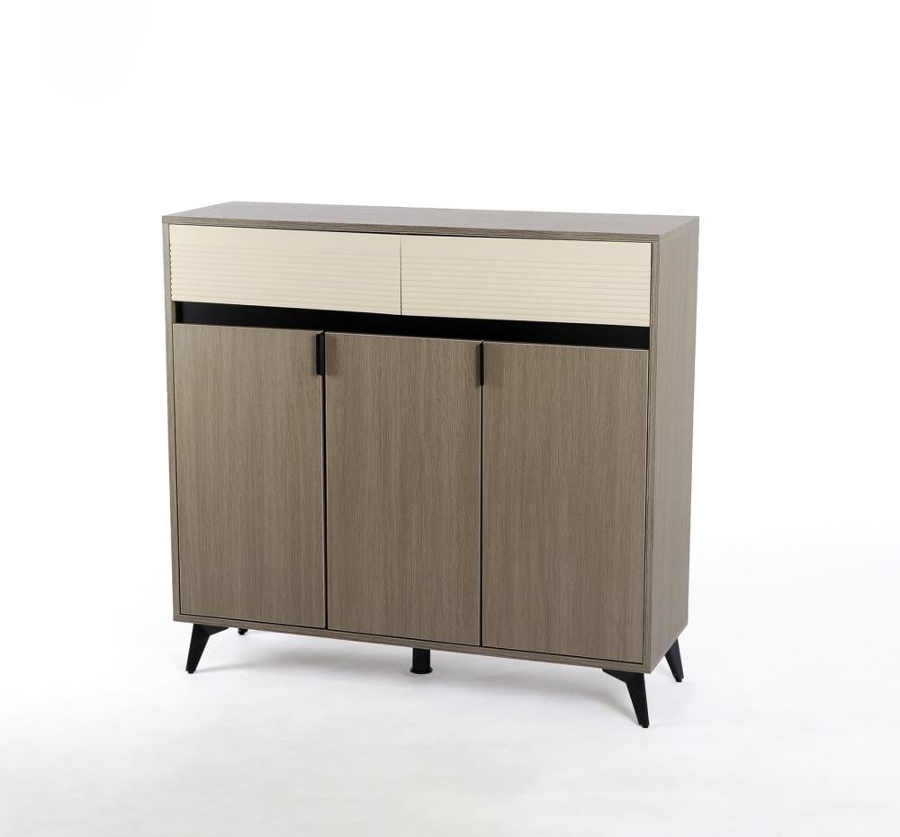 خزانة الأحذية المودرن هذه، المصممة خصيصًا لتلبية احتياجاتك الجمالية والوظيفية. تتميز هذه الخزانة بتصميمها الفريد المزدوج اللون الذي يجمع بين دفء الخشب الطبيعي الفاتح وأناقة اللون البيج الكريمي، مفصولين بشريط أفقي داكن يضفي تباينًا عصريًا وجذابًا.