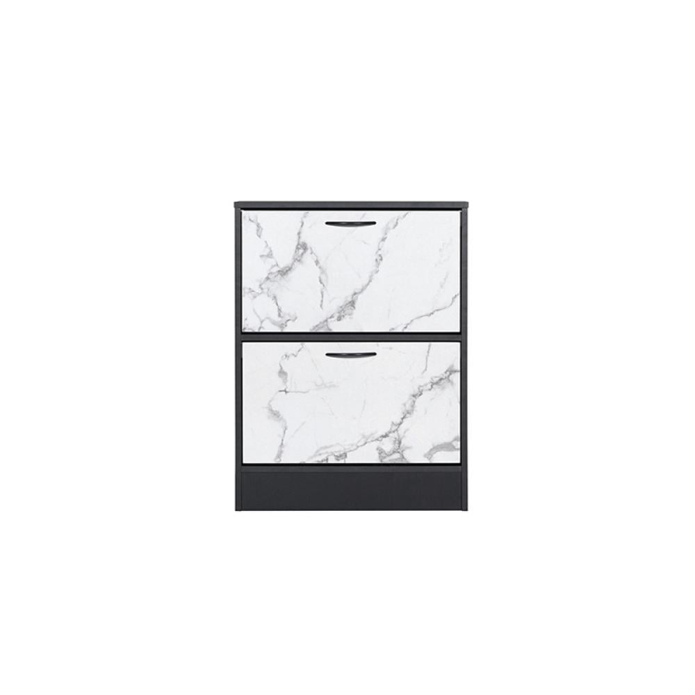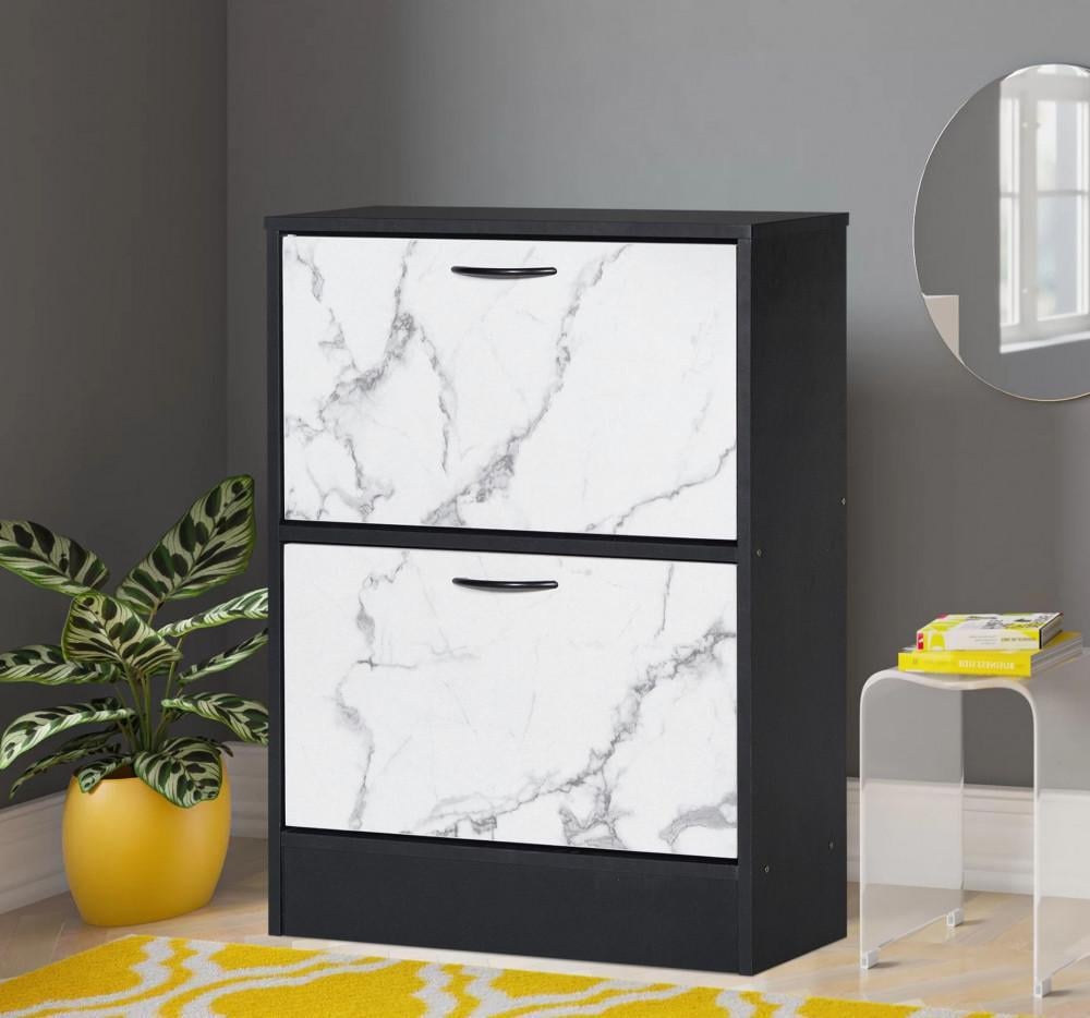 دولاب أحذية خشب ماليزي متين بتصميم أنيق يجمع بين الأبيض الرخامي والأسود العصري، مزود بدرجين قلاب سهل الاستخدام ورفين داخليين يتسعان لعدد كبير من الأحذيه