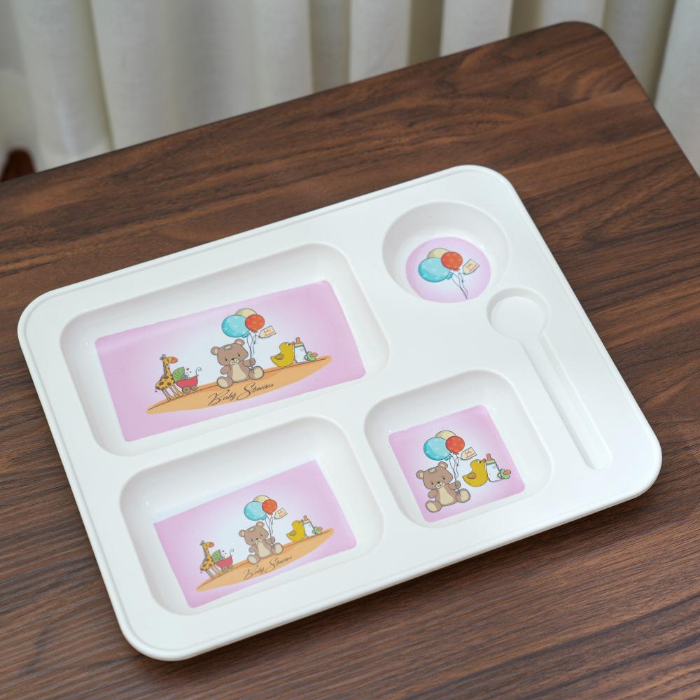 صحن بلاستيك للأطفال مزوّد بعدّة أقسام لتقسيم الطعام بشكل منظّم، ويحتوي على رسومات ملونة محببة للأطفال مثل الدمى والزهور وشخصيات كرتونية مرحة.