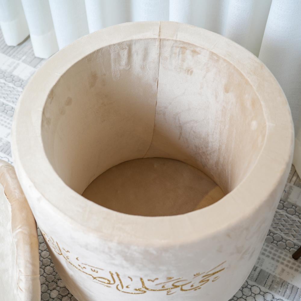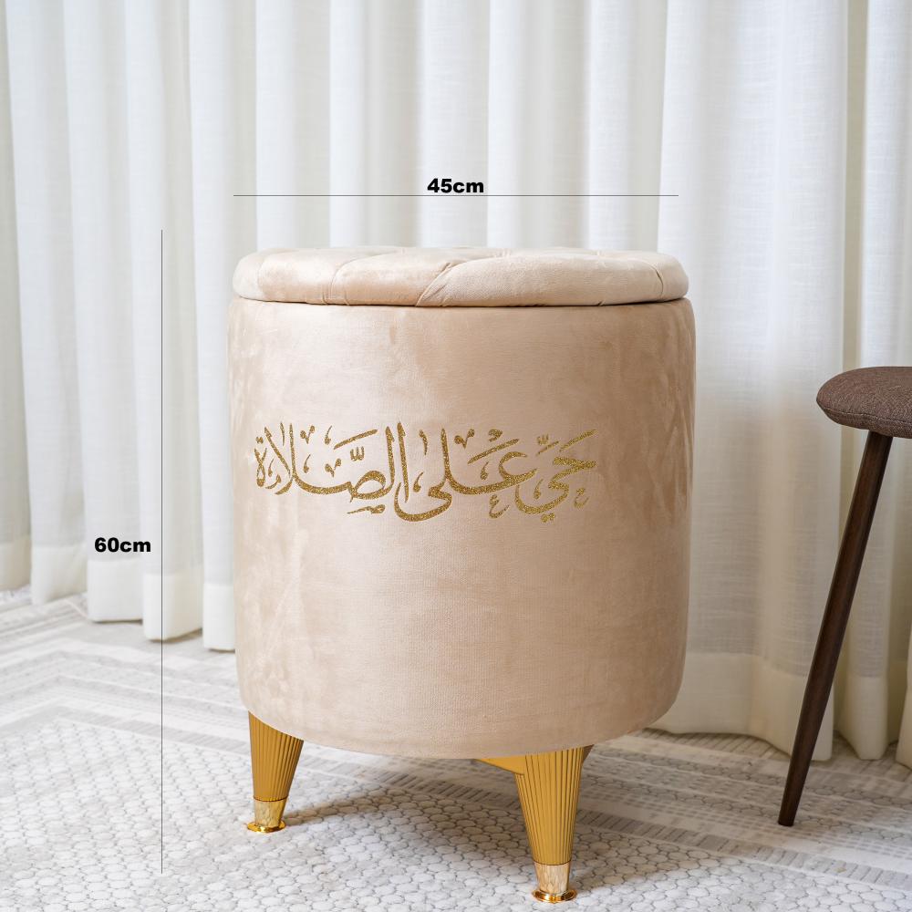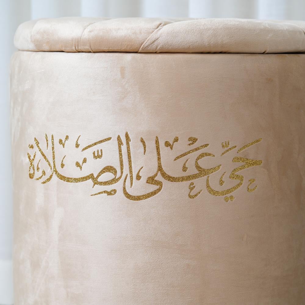 صندوق سجاد أنيق بتطريز عبارة "حي على الصلاة"، يجمع بين الوظيفة والجمال لحفظ سجادات الصلاة بطريقة مرتبة وراقية.