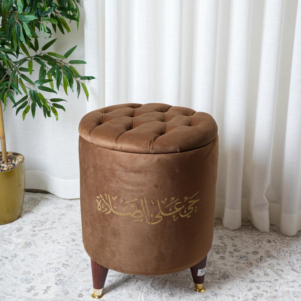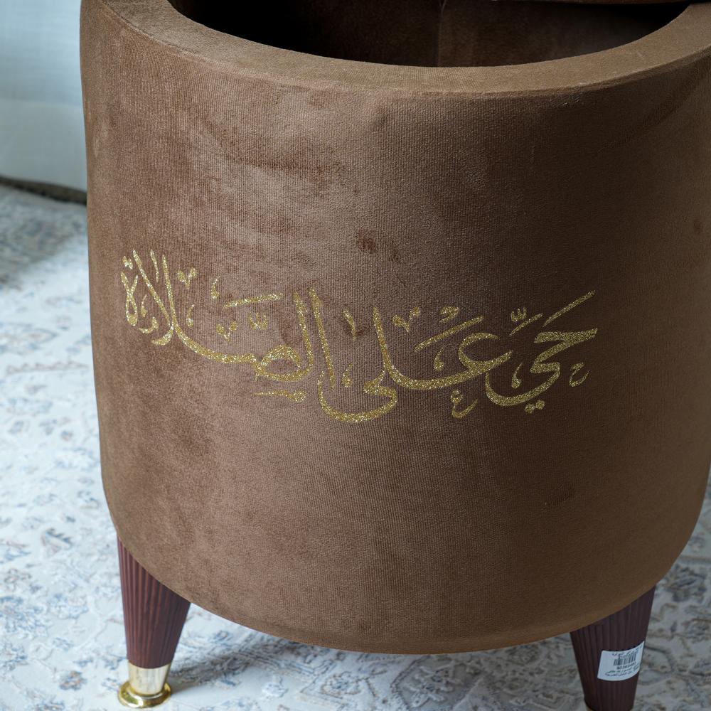 صندوق سجاد أنيق بتطريز عبارة "حي على الصلاة"، يجمع بين الوظيفة والجمال لحفظ سجادات الصلاة بطريقة مرتبة وراقية.