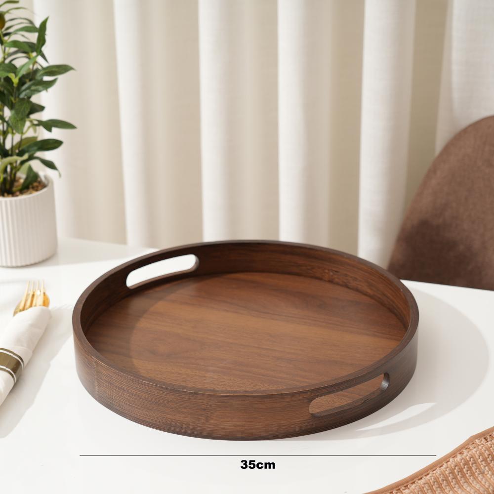 أضف لمسة أنيقة لضيافتك مع صينية تقديم خشبية عملية بتصميم دائري أنيق.