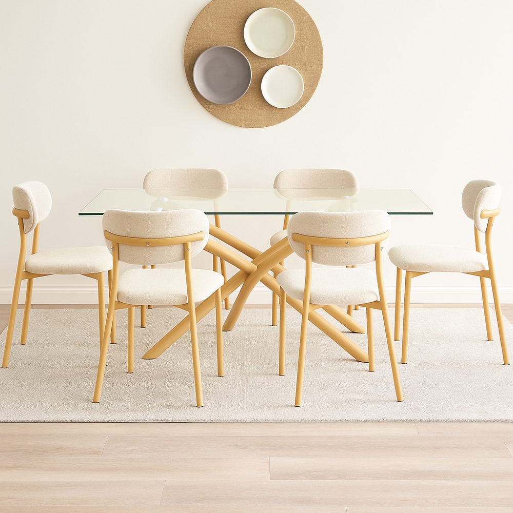 طقم طاولة الطعام بتصميم حديث يوازن بين البساطة والفخامة، مثالي لإضافة أجواء مريحة ومرتبة لغرفة الطعام