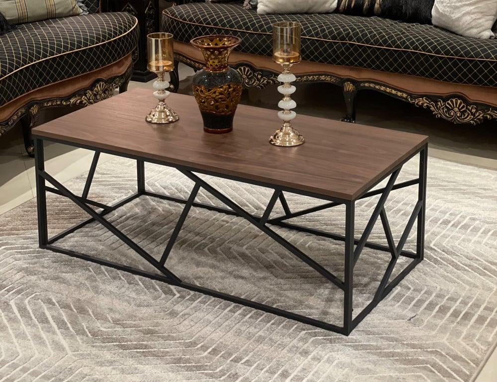طاولة قهوة أنيقة تجمع بين دفء الخشب ومتانة الحديد. تتميز بسطح خشبي مستطيل وقاعدة معدنية بتصميم هندسي فريد