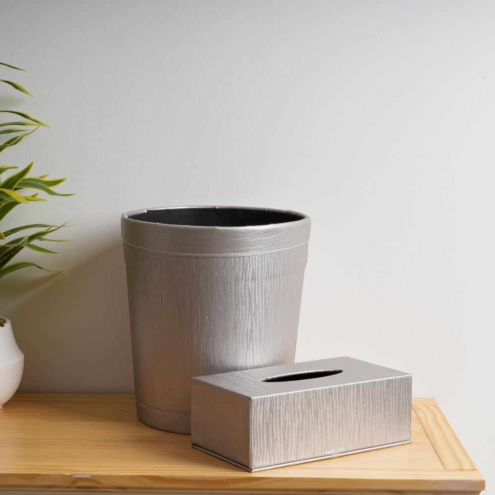 أضف لمسة من الفخامة العصرية إلى مساحتك مع طقم السلة وعلبة المناديل باللون الفضي، تصميم أنيق يدمج البساطة الحديثة مع المظهر الراقي ليمنح غرفتك أو مكتبك لمسة من التنظيم والأناقة.