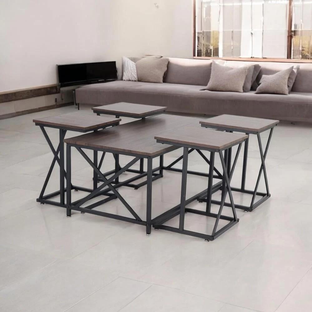 تصميم 5 في 1 (متداخل): يتكون من طاولة قهوة رئيسية كبيرة وأربع طاولات جانبية أصغر قابلة للتخزين تحتها، مما يوفر مساحة عند عدم الاستخدام.