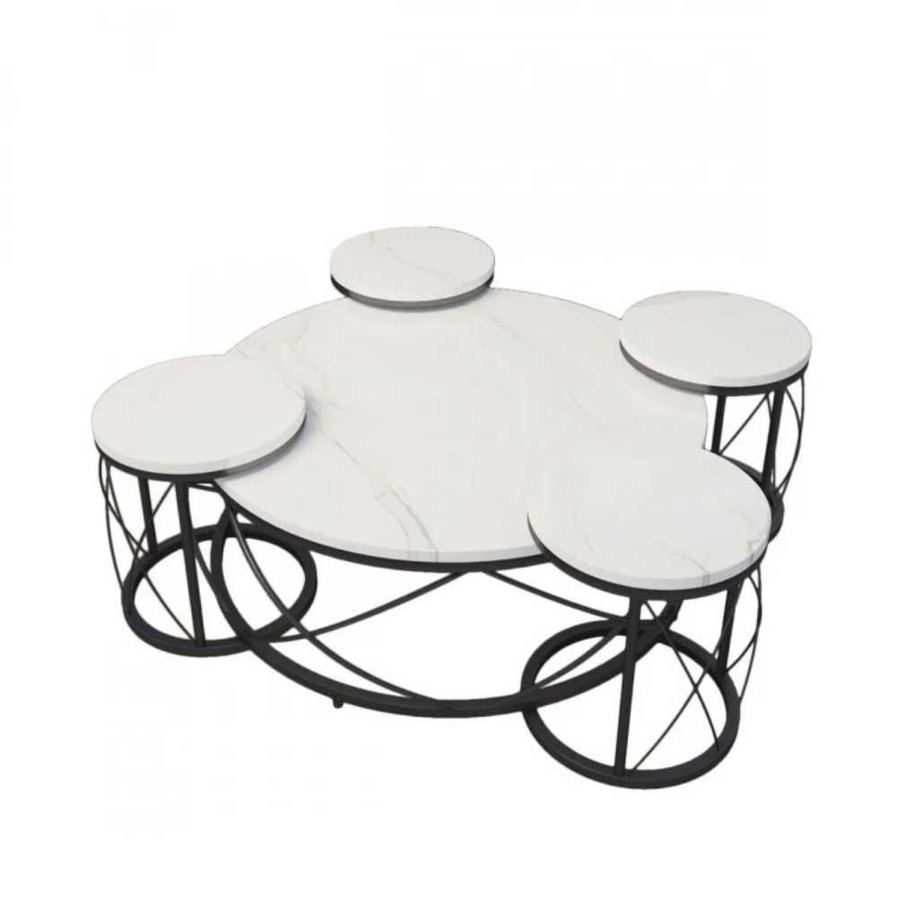 - طقم متكامل: يضم الطقم طاولة رئيسية كبيرة وأربع طاولات جانبية صغيرة، مما يوفر حلاً عمليًا ومتناسقًا لجميع احتياجاتك.
