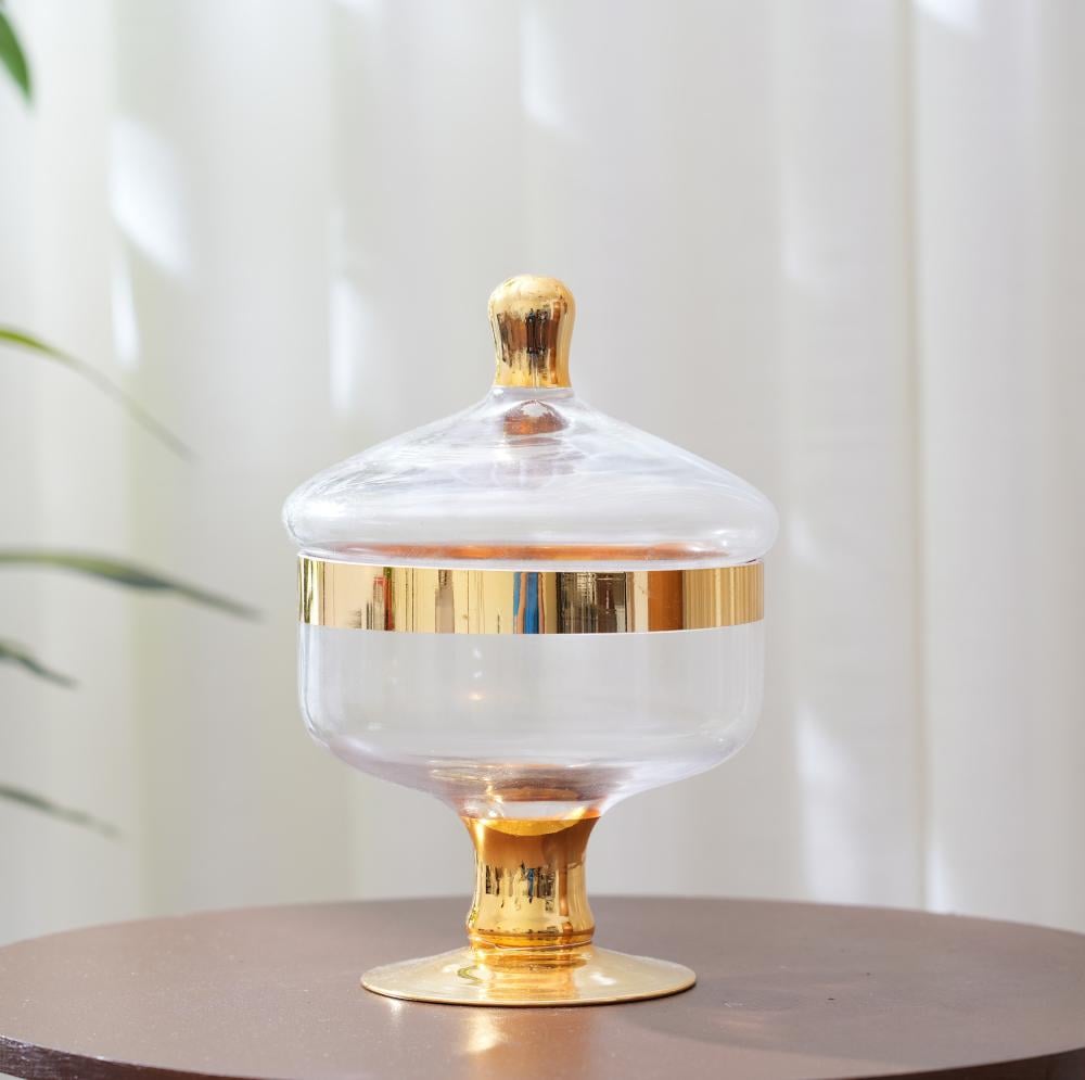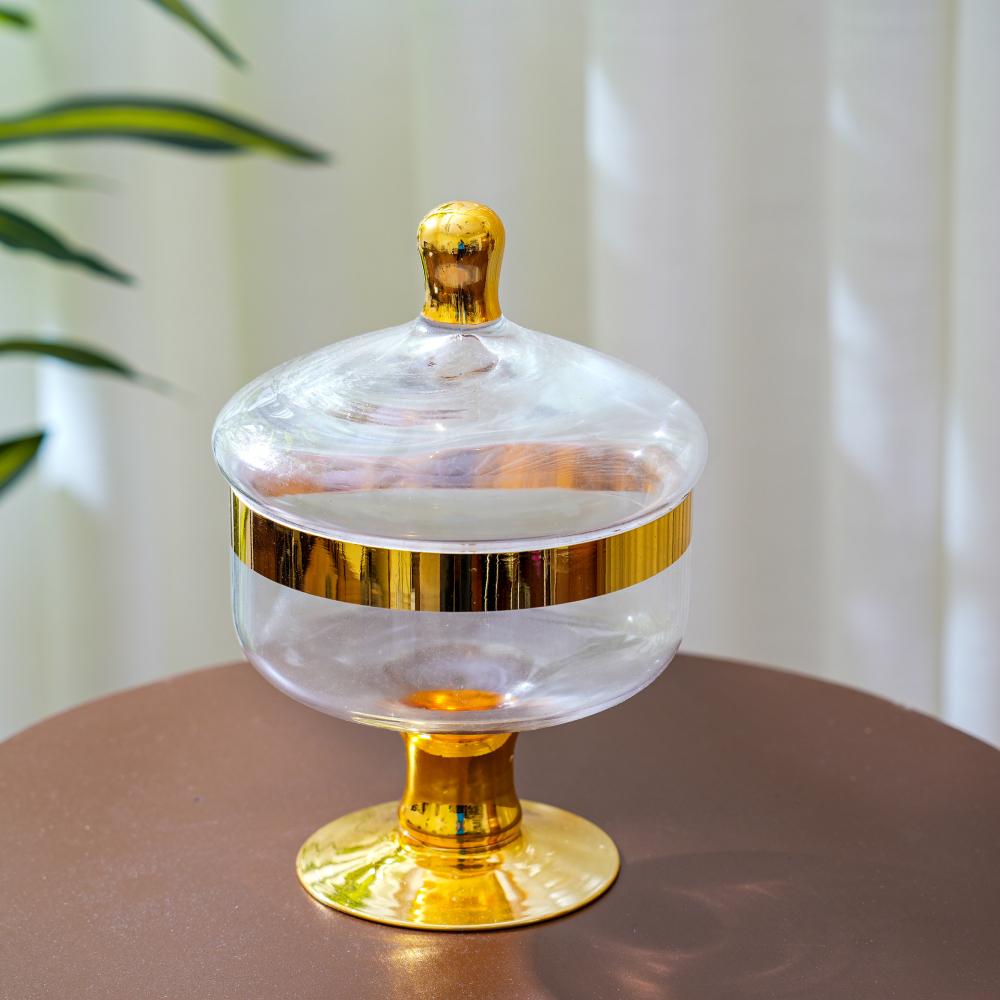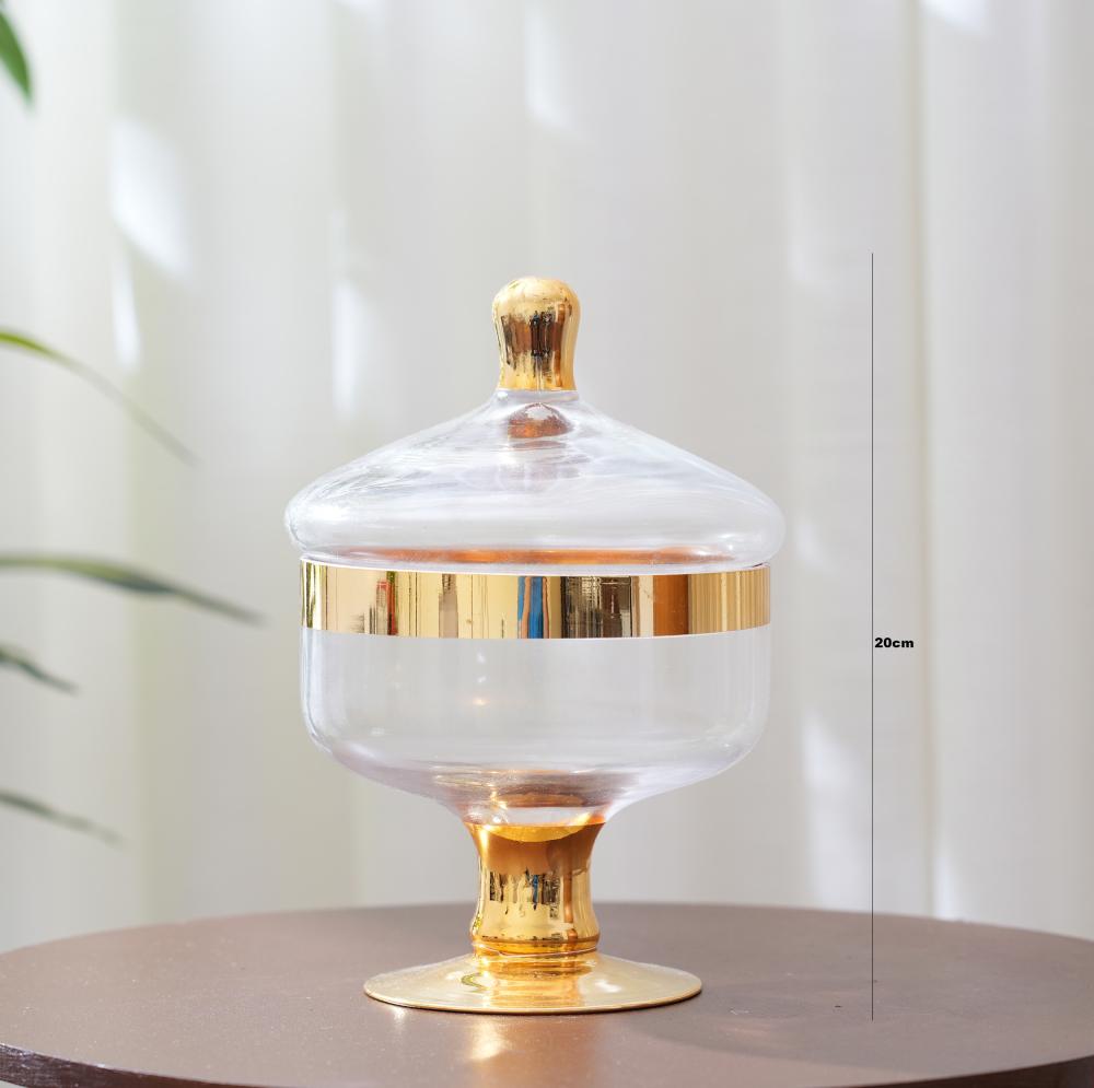 علبة تقديم الحلوي زجاج بغطاء بتصميم مميز باللون الشفاف والذهبي مقاس 20 سم