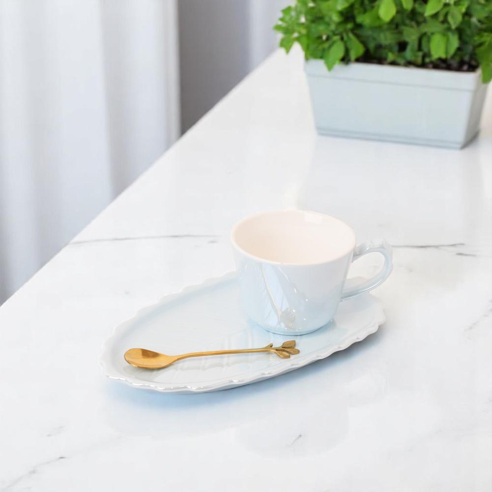 فنجان قهوة سيراميك مع صحن وملعقة بتصميم مميز باللون الازرق