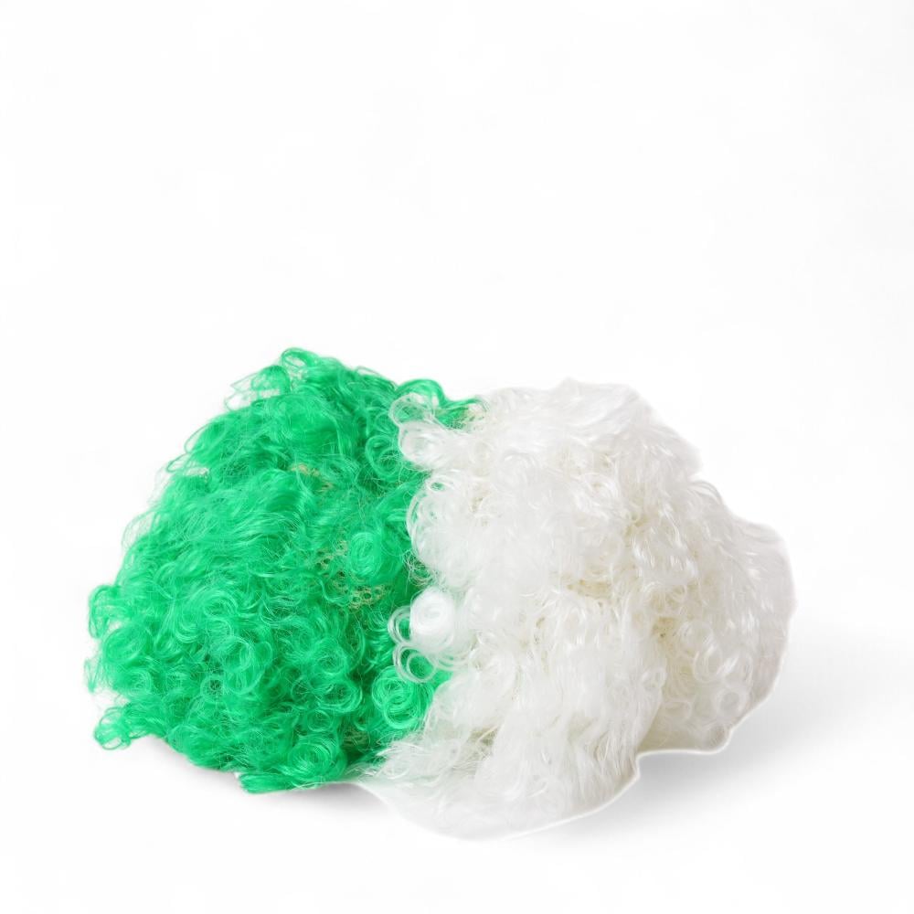 باروكة شعر مستعار باللونين الأخضر والأبيض، مصممة خصيصًا لاحتفالات اليوم الوطني. خفيفة الوزن ومريحة للارتداء، مناسبة للأطفال والكبار، وتمنح إطلالتك طابعًا مرحًا ومميزًا يعكس حبك للوطن.