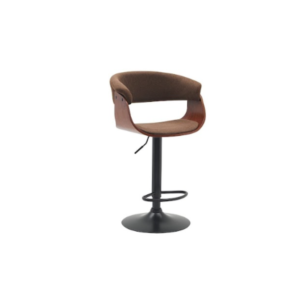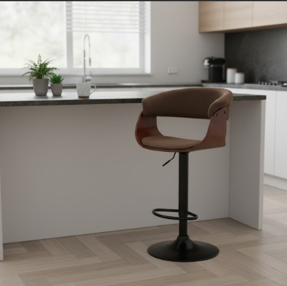 كرسي بار أنيق يجمع بين الخشب والقماش مع قاعدة حديد متينة قابلة للتعديل في الارتفاع. تصميم عصري يوفر الراحة والعملية في آن واحد، مناسب للمطابخ المفتوحة، البارات المنزلية أو حتى المقاهي.
