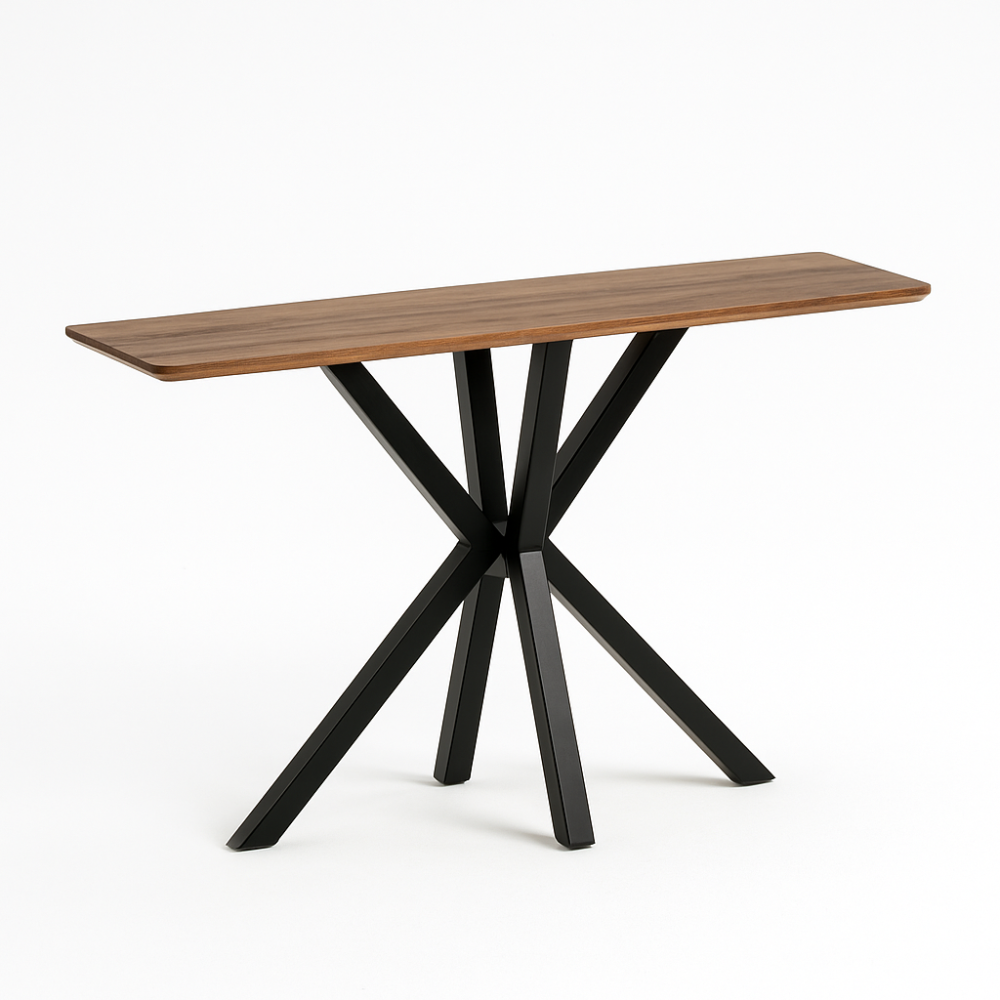 كونسول عصري وأنيق، يجمع بين سطح خشبي دافئ وقاعدة معدنية بتصميم هندسي فريد، مما يجعله قطعة مميزة للمداخل أو غرف المعيشة.