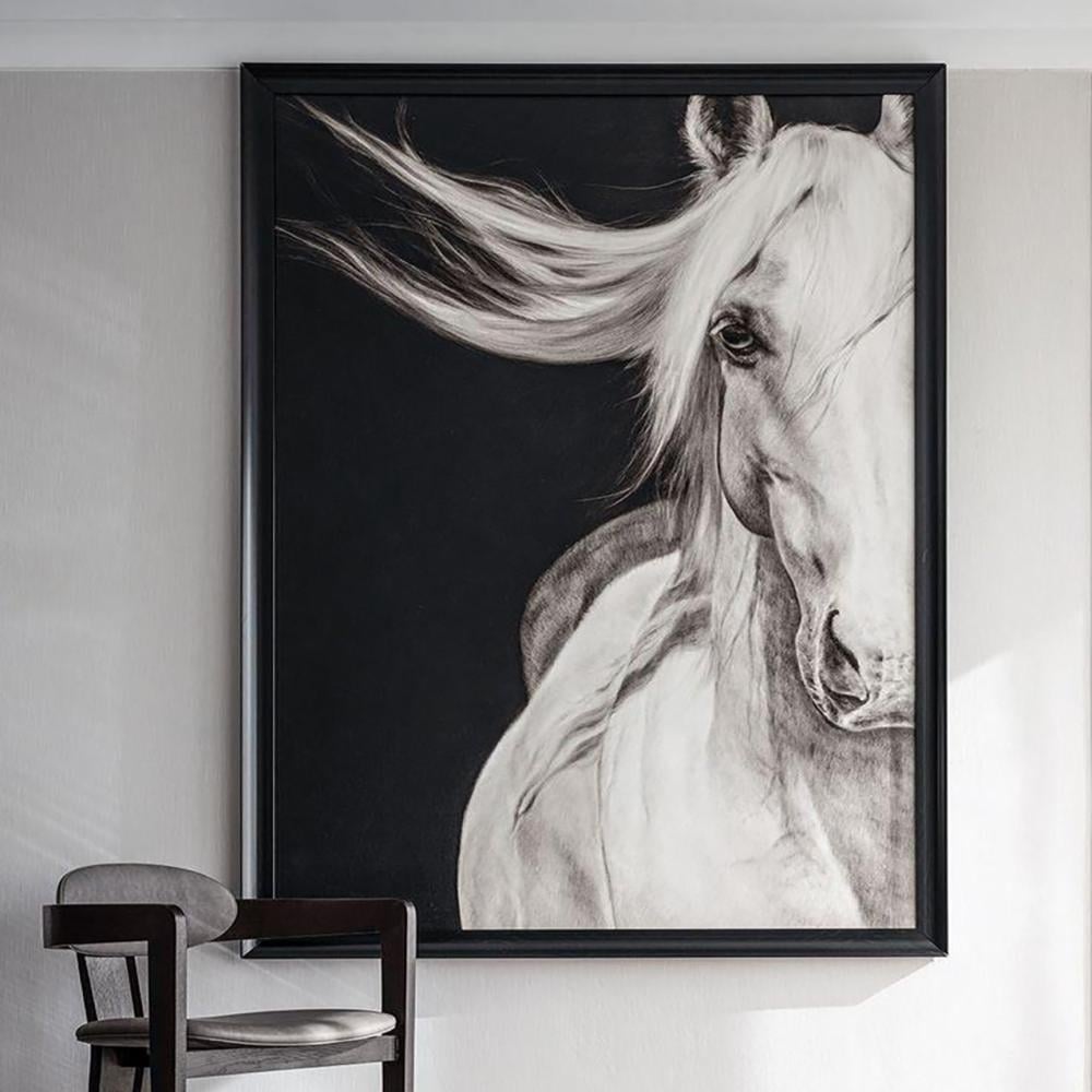 تتميز اللوحة بتفاصيل دقيقة تعكس جمالية الخيول وتضفي على المكان طابعاً حيوياً وواقعيًا مما يجعلها تحفة تلفت الأنظار