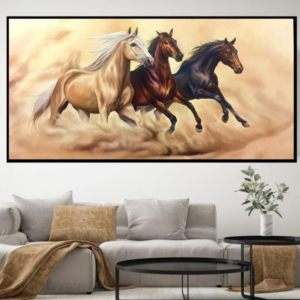 تتميز هذه اللوحة بتفاصيلها الدقيقة التي تبرز تصميم الخيول بشكل رائع مما يجعلها خياراً مثالياً لإضافة لمسة فنية أنيقة لأي مكان