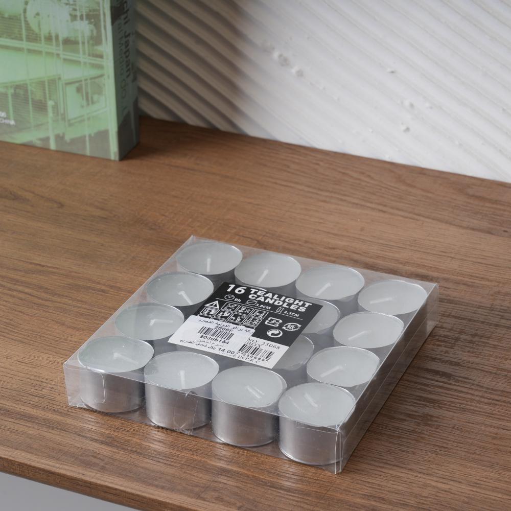 مجموعة شموع صغيرة (Tealight) تتكوّن من 16 قطعة بلون أبيض أنيق، تأتي داخل علبة شفافة مرتبة بعناية. يمكن استخدامها لتزيين الطاولات، أو لإضفاء لمسة دافئة في الحمام وغرف المعيشة.