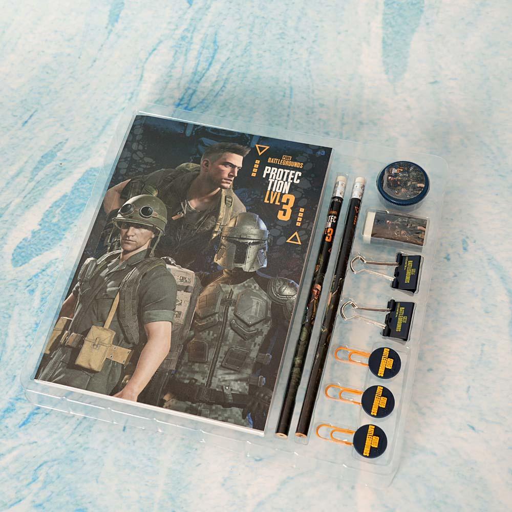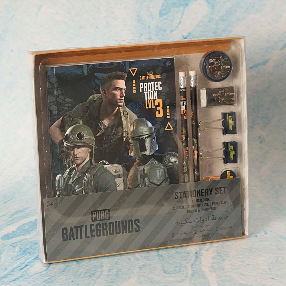 مكون من: 2 قلم رصاص، 1 نوت بوك، 2 مشبك ماسك، 3 مشبك ورق، ممحاة، مبراة