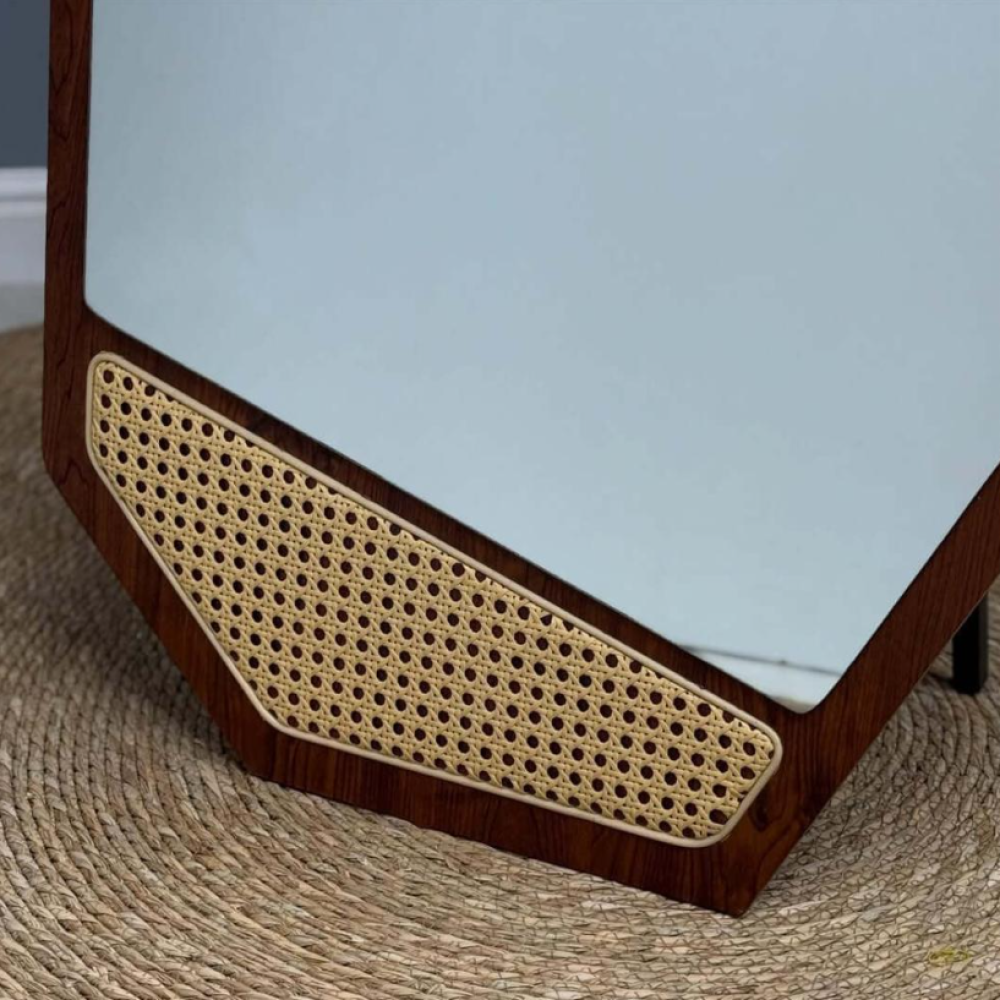 تتميز بإطار خشبي فاخر مع تفاصيل من القش المنسوج في الأعلى والأسفل، ما يمنحها مظهراً فريداً يجمع بين الطابع الكلاسيكي والحديث.