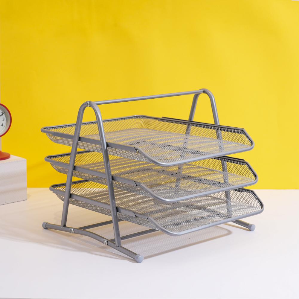 منظم ملفات معدني بثلاثة أرفف يساعدك على ترتيب الأوراق والمستندات بطريقة عملية. تصميم أنيق بلون رمادي يناسب المكاتب والمدارس ويسهل الوصول إلى الملفات اليومية.