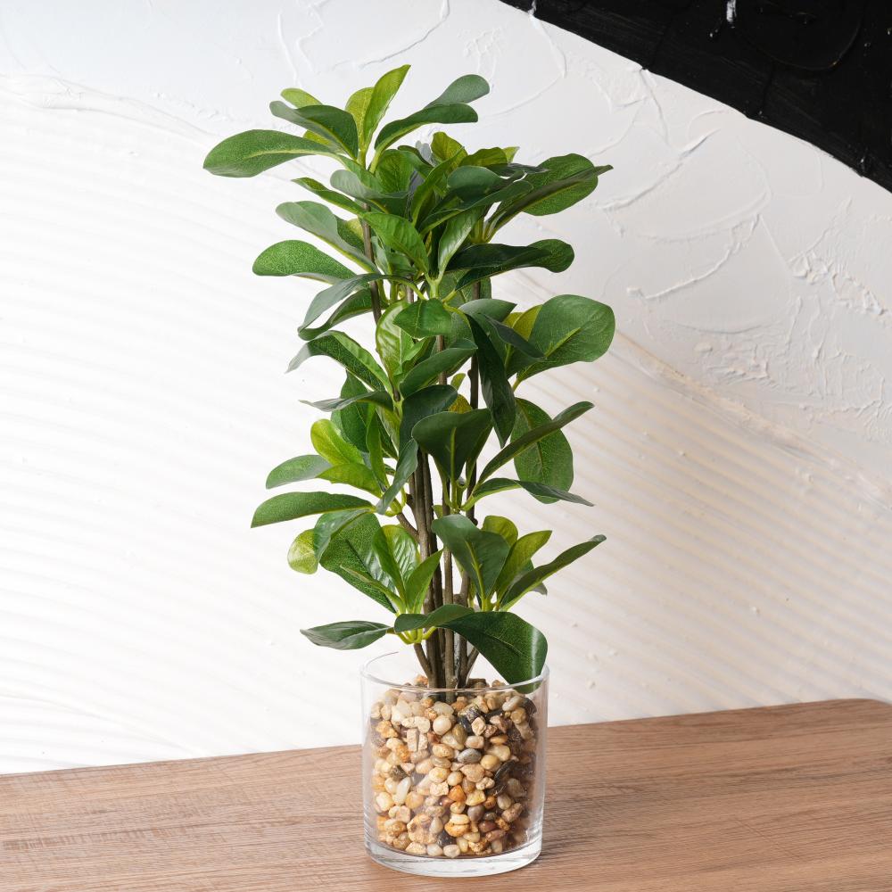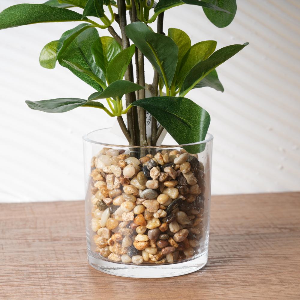 نبتة صناعية بتصميم عصري داخل وعاء زجاجي شفاف مملوء بأحجار زينة ملونة، تضفي مظهرًا فاخرًا يناسب جميع أنماط الديكور — من العصري إلى الكلاسيكي.