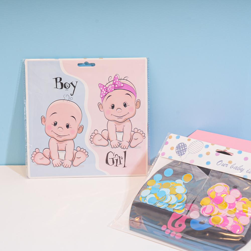 - يتضمن قصاصات وردية وزرقاء تكشف جنس المولود