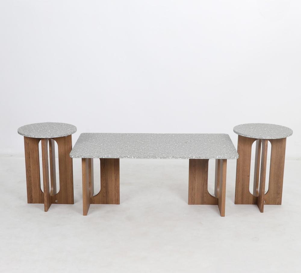 يتكون الطقم من طاولة قهوة مستطيلة مركزية وطاولتين جانبيتين مستديرتين مصممة بعناية لتلبية احتياجات الضيافة والجمال في آن واحد. تتميز الأسطح برخام الأنيق الذي يضيف طابعًا فريدًا وعصريًا بينما توفر القواعد الخشبية ذات اللون الدافئ والبنية القوية ثباتًا ودعمًا ممتازًا